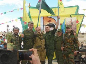 Suriye'nin Afrin kentinde üs kuracakları yolundaki iddialar gölgesinde Rus askerleri dün Halep'teki nevruz kutlamalarına katılarak, PYD/YPG flamalarıyla poz verdi.