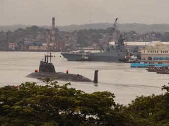 Rusya'nın en üst düzey nükleer denizaltısı Kazan, Korshakov füze fırlatma fırkateyni ile birlikte Havana limanına yanaşmak üzere.