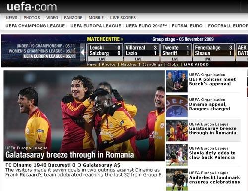 UEFA Avrupa Ligi'ndeki temsilcimiz Galatasaray'ın, deplasmanda seyircisiz oynanan maçta Romanya'nın Dinamo Bükreş takımını 3-0 mağlup etmesi UEFA'nın resmi sitesinde manşette yer aldı.
