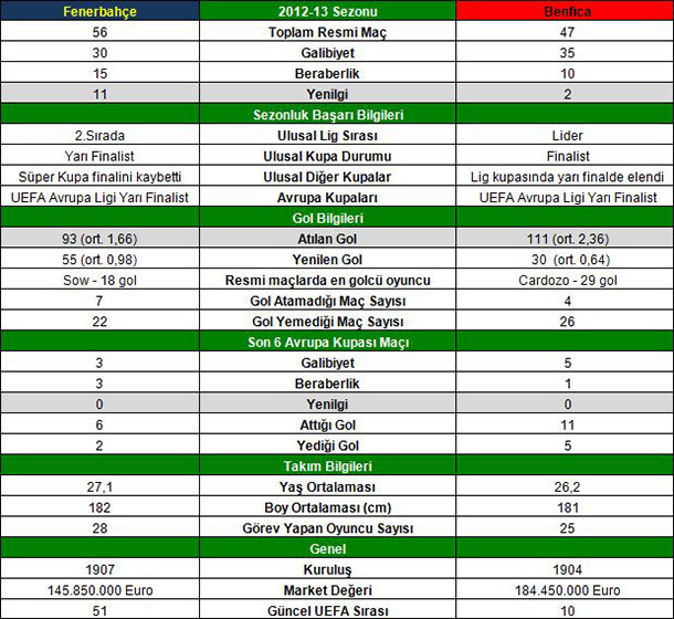 Benfica bu sezon 47 maçta 111 gol atarken maç başına 2,36 gol ortalaması yakaladı. Fenerbahçe ise 56 maçta 93 gol ile 1,66 ortalama tutturdu. Fenerbahçe 55 gol yedi ve maç başına kalesinde 0,98 gol görürken Benfica 30 yedi ve 0,64 ortalamaya sahip oldu. Sezon boyunca Benfica sadece 4 maçta, Fenerbahçe ise sadece 7 maçta gol atamadı.