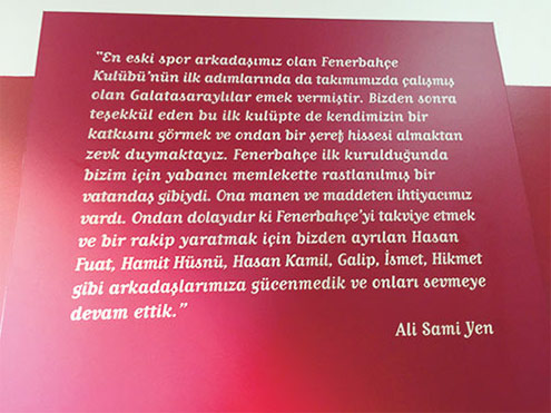 Bu sözler Beyoğlu’nda Galatasaray Lisesi’nin karşısındaki 90 numaralı binada yer alan Galatasaray Müzesi’nde özel bir bölümde sergileniyor. Bu ifadelerde Fenerbahçe’nin kurucularından olduğu öne sürülen Galip Bey’in de ismi geçiyor.