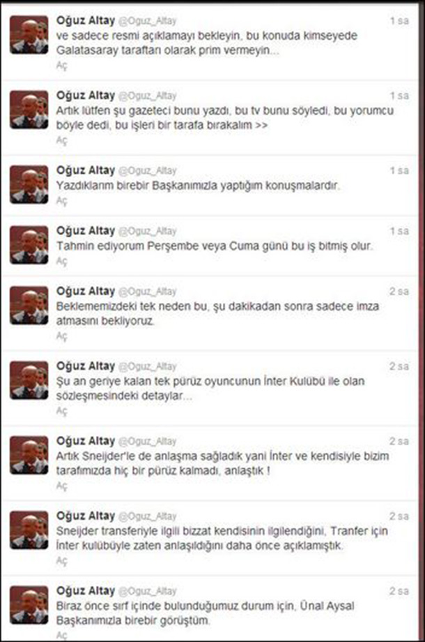 Galatasaray taraftar grubu ultrAslan başkanı Oğuz Altay, Galatasaray Başkanı Ünal Aysal ile yaptığı Sneijder görüşmesini taraftarlarla paylaştı.