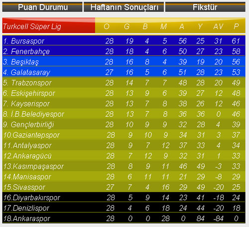 Turkcell Süper Lig'de 28. haftasında oynanan maçlarda alınan sonuçlar, yarının programı, son