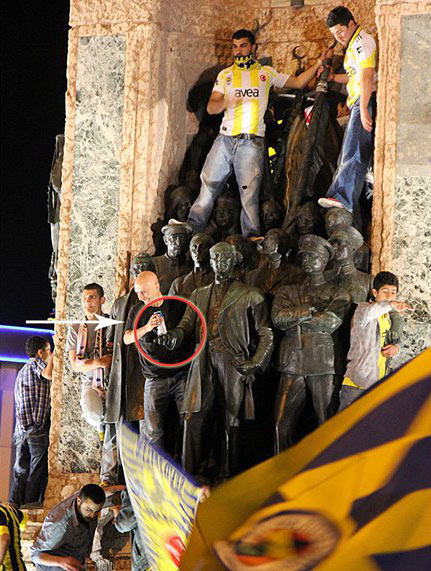 Atatürk heykelinin eline bira kutusu tutuşturan bir taraftar çirkin görüntüler oluşturdu.