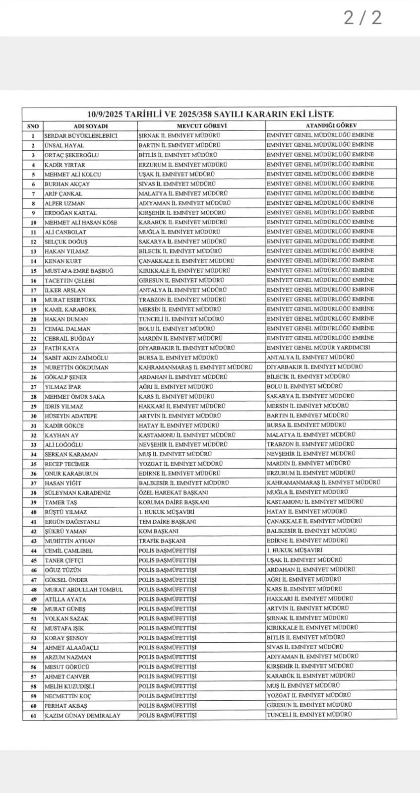 AKP Genel Başkanı ve Cumhurbaşkanı Recep Tayyip Erdoğan’ın imzasını taşıyan atama kararları, 11 Eylül 2025 tarihli Resmî Gazete’de yayımlandı.