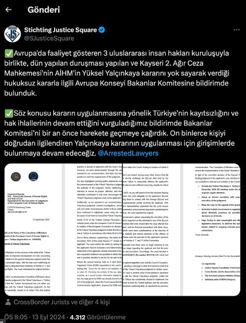 Sosyal medya platformunda bildirim yayınlayan Hollanda merkezli insan hakları kuruluşu Justice Square Foundation, mesajında şu açıklamayı yaptı: ‘Söz konusu kararın uygulanmasına yönelik Türkiye’nin kayıtsızlığını ve hak ihlallerinin devam ettiğini vurguladığımız bildirimde Bakanlar Komitesi’ni bir an önce harekete geçmeye çağırdık. On binlerce kişiyi doğrudan ilgilendiren Yalçınkaya kararının uygulanması için girişimlerde bulunmaya devam edeceğiz.’