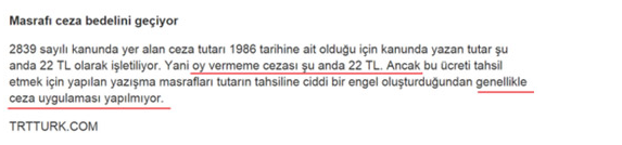 "2839 sayılı kanunda yer alan ceza tutarı 1986 tarihine ait olduğu için kanunda yazan tutar şu anda 22 TL olarak işletiliyor. Yani oy vermeme cezası şu anda 22 TL. Ancak bu ücreti tahsil etmek için yapılan yazışma masrafları tutarın tahsiline ciddi bir engel oluşturduğundan genellikle ceza uygulaması yapılmıyor."