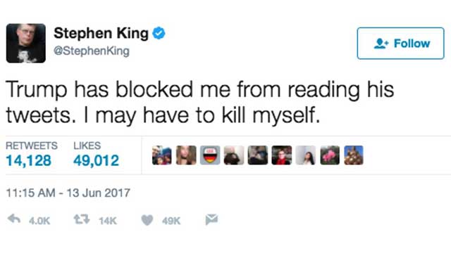 Twitter'da sık sık Trump’ı eleştiren ve son olarak “Trump’ın kabinesi lisansüstü seviyede yalakalık dersi vermeli” diyen King, Trump’ın kendisini engellemesinin ardından “Trump, beni tweetlerini okumaktan blokladı. Kendimi öldürmek zorunda kalabilirim” diye yazdı.
