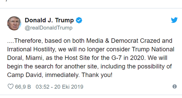 ABD Başkanı Trump, Twitter hesabından yaptığı açıklamada, medyanın ve Demokratların, bu konunun gereksiz yere fazlasıyla üstüne gittiğini savunarak, "Artık Miami'deki Trump National Doral'ı 2020'de yapılacak G-7 Zirvesi için düşünmüyoruz. Camp David de dahil derhal yeni yerler aramaya başladık." ifadelerini kullandı.