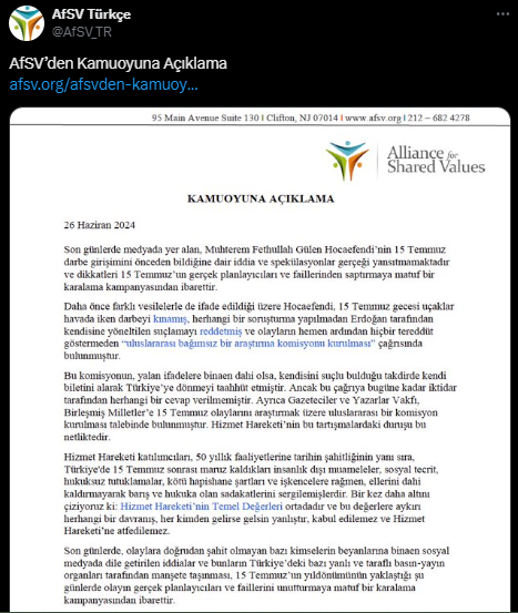 Hizmet Hareketi ile ilgili açıklama yapma konumunda olan ve Hizmet Hareketi’nin ana akımını temsil eden heyetlerle istişare halinde hareket eden Alliance for Shared Values (AfSV), bir açıklama yaptı. (Link) Açıklamanın detayına girmeden önce, ifade etmeliyim ki, AfSV’nin bu açıklaması, geçmişte yaptığı açıklamaların tonuna bakıldığında nispeten daha sert bir dille kaleme alınmış. Öyle anlaşılıyor ki, spekülasyonların mesnetsizliği orantısında ve her yıl aynı stratejinin işletilmesi karşısında ‘‘HEMEN DARBE SONRASI BİZZAT HOCAEFENDİ BAĞIMSIZ ARAŞTIRMA KOMİSYONU KURULSUN TALEBİNDE BULUNMUŞKEN, BİZ DAHA NE DİYELİM? ASIL ERDOĞAN REJİMİ CEVAPLAMAKTAN 8 YILDIR KAÇTIĞI SORULARI YANITLASIN!‘‘ düşüncesi hakim olmuş.