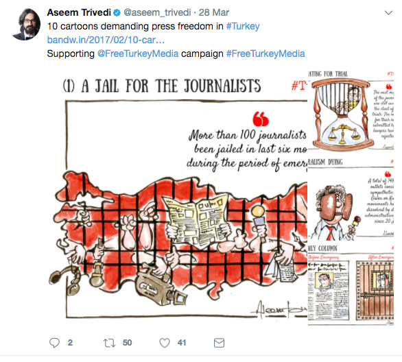 Türkiye'deki hukuk dışı uygulamaları dünya gündemine taşımak için sanat dilini kullanmaya devam edeceğini ifade eden Aseem Trivedi, dünden bu yana da kaçırılan 13 kişi için yaptığı çizimlerle gündemde.
