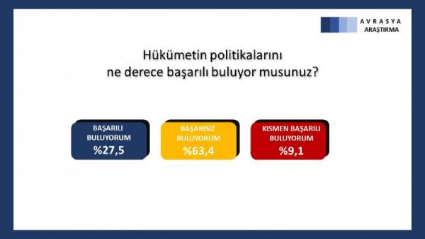 Araştırmada hükümeti başarısız bulanların oranı yüzde 63,4 olarak belirlendi. Başarılı bulanlar ise sadece yüzde 27,5 oldu.