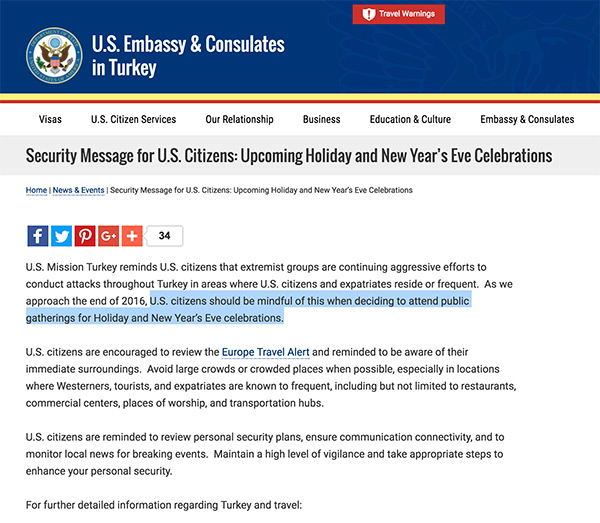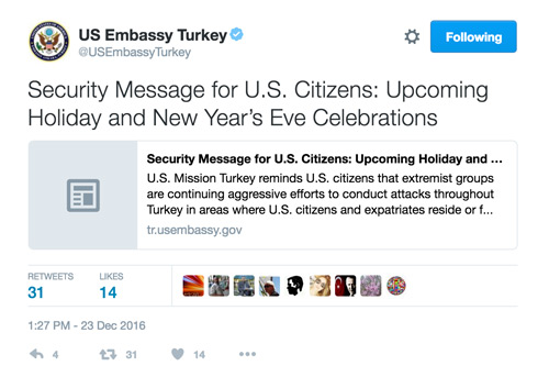İşte Reina'nın sahininin de olay sonrası anlattığı gibi; ABD Büyükelçiliği tarafından sosyal medyada ve web sitesinde yayınlanan güvenlik uyarısı:
