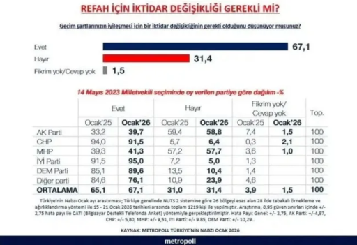 MetroPOLL Araştırma, 15-21 Ocak 2026 tarihli “Türkiye’nin Nabzı” çalışmasında katılımcılara “Geçim şartlarınızın iyileşmesi için bir iktidar değişikliğinin gerekli olduğunu düşünüyor musunuz?” sorusunu yöneltti. Araştırma, yanıtların genel dağılımını ve 14 Mayıs 2023 seçiminde oy verilen partiye göre “evet/hayır” oranlarını gösterdi.