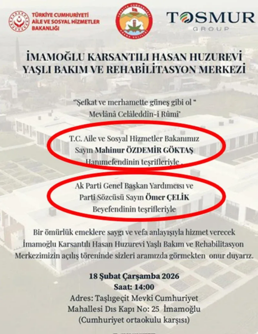 Sözcü’nün haberine göre, 16 Ocak 2023’te Adana Aile ve Sosyal Hizmet İl Müdürlüğü ile Tosmur Grubu arasında, İmamoğlu ilçesinde yapılacak 78 kapasiteli huzurevi için protokol imzalandı. Yapımı yaklaşık 3 yıl süren huzurevinin açılışı için Adana Valiliği tarafından, üzerinde Aile Bakanlığı, Valilik ve Tosmur Grup logolarının bulunduğu davetiye hazırlandı.